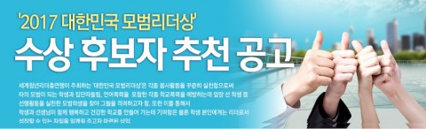 ¼­¿ï--(´º½º¿ÍÀ̾î) 2017³â 10¿ù 18ÀÏ -- ¼¼°èû³â¸®´õÃÑ¿¬¸Í(ÃÑÀç ÀÌ»êÇÏ, ÀÌÇÏ ¼¼°è¿¬¸Í)Àº ¡®2017 ´ëÇѹα¹ ¸ð¹ü¸®´õ»ó¡¯ ¼ö»ó Èĺ¸ÀÚ Á¢¼ö±â°£À» 11¿ù 10Àϱî..