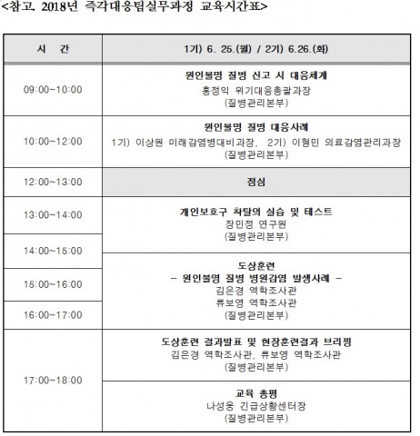 ÀÌ¿¡ Àη°³¹ß¿øÀº Áúº´°ü¸®º»ºÎ ±ä±Þ»óȲ¼¾ÅÍ¿Í Çù·ÂÇÏ¿© »ç·Ê¿Í ¸ðÀÇÈÆ·ÃÀ» Áß½ÉÀ¸·Î ¡®Áï°¢ ´ëÀÀÆÀ ½Ç¹«°úÁ¤¡¯À» °³¼³ÇÏ¿´´Ù. ÁÖ¿ä ±³°ú¸ñÀº ¡â¿øÀκҸí Áúº´ ½Å°í ½Ã ´ëÀÀü°è ¡â¿øÀκҸí Áúº´ ´ëÀÀ»ç·Ê ¡â°³ÀÎ º¸È£±¸ ÂøÅ»ÀÇ ½Ç½À ¹× Å×½ºÆ® ¡â¿øÀÎºÒ¸í º´¿ø°¨¿° ¹ß»ý»ç·Ê µµ»óÈÆ·Ã ¡âµµ»óÈÆ·Ã °á°ú¹ßÇ¥ ¹× ÇöÀåÈÆ·Ã°á°ú ºê¸®ÇÎ µîÀÌ´Ù.