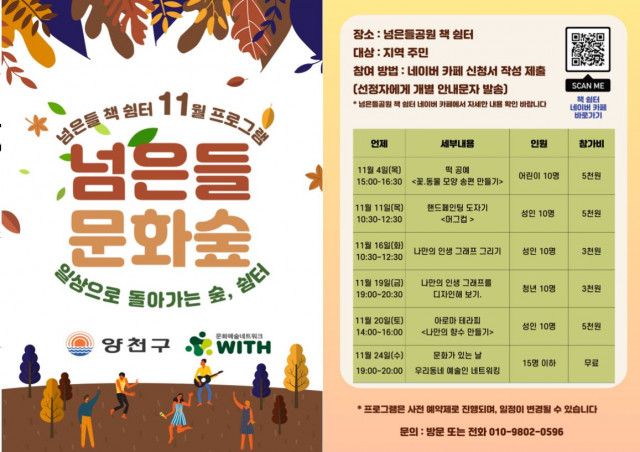 ¼­¿ï--(´º½º¿ÍÀ̾î) 2021³â 11¿ù 09ÀÏ -- ¹®È­¿¹¼ú³×Æ®¿öÅ© À§µå´Â ¾çõ±¸°¡ ³ÑÀºµé°ø¿ø Ã¥½°ÅÍ¿¡¼­ 11¿ù ´Ù¾çÇÑ ¹®È­ ÇÁ·Î±×·¥À» ½Ç½ÃÇÑ´Ù°í 9ÀÏ ¹àÇû´Ù.°Ç°­ÇÑ ½£, ¹®È­°¡..