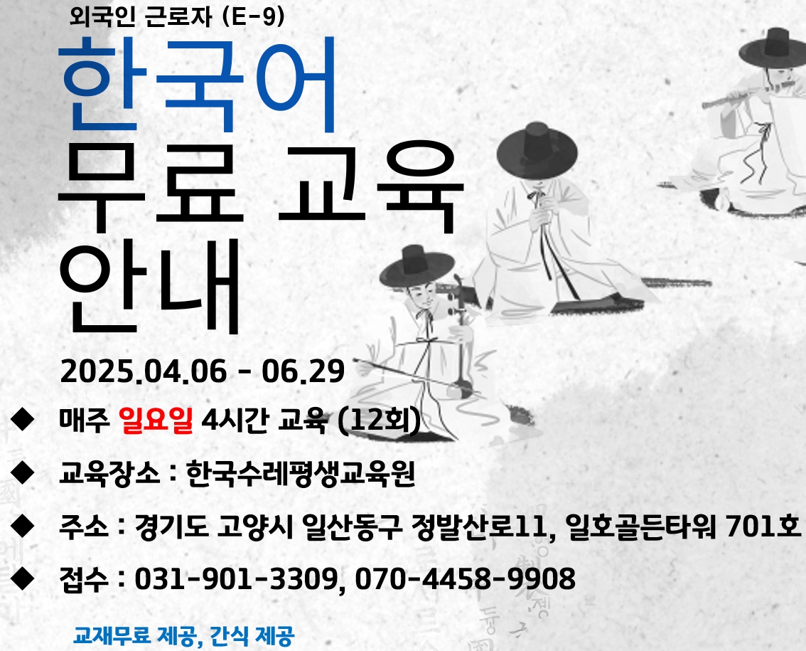 °æ±âµµ °í¾ç½Ã¿¡ À§Ä¡ÇÑ Çѱ¹¼ö·¹Æò»ý±³À°¿øÀº ¿Ü±¹ÀÎ ±Ù·ÎÀÚ(E-9, H-2)¸¦ ´ë»óÀ¸·Î Àü¾× ±¹ºñÁö¿ø(¹«·á) Çѱ¹¾î ±³À°À» °³°ÇÑ´Ù. ÀÌ ±³À°Àº »ê¾÷Àη°ø´ÜÀÇ Áö¿øÀ» ¹Þ¾Æ ÁøÇàµÇ¸ç, Çѱ¹¾î ±¸»ç¿¡ ¾î·Á¿òÀ» °Þ°í ÀÖ´Â ¿Ü±¹ÀÎ ±Ù·ÎÀÚ¶ó¸é ´©±¸³ª ½ÅûÇÒ ¼ö ÀÖ´Ù.